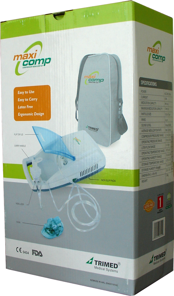 • Kit yang lengkap : botol nebulizer, selang udara, saringan udara, masker dewasa, masker anak, nose piece, mouth piece, carrying bag
